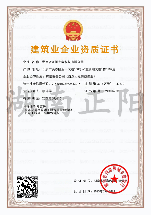 湖南省正陽光電科技有限公司是一家從事亮化工程及大型燈光藝術(shù)的設(shè)計(jì)、制作、安裝和維護(hù)于一體的專業(yè)化公司。公司資質(zhì)齊全、管理嚴(yán)謹(jǐn)、技術(shù)先進(jìn)、實(shí)力雄厚,取得了城市及道路照明工程專業(yè)承包壹級(jí)資質(zhì)、照明工程設(shè)計(jì)專項(xiàng)甲級(jí)資質(zhì)、機(jī)電工程施工總承包貳級(jí)資質(zhì)、施工勞務(wù)等資質(zhì),榮獲“重質(zhì)量·守誠(chéng)信”示范企業(yè)。